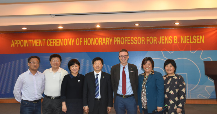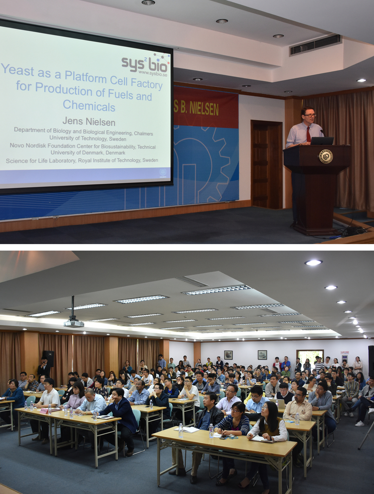 受聘仪式后,Jens Nielsen院士为36365官网师生作了题为“Yeast as a Platform Cell Factory for Production of Fuels and Chemicals”的学术报告。报告围绕酿酒酵母代谢工程改造,酿酒酵母系统生物学,以及实验室进化等方面,系统介绍了近年来其领导的查尔姆斯理工大学系统生物技术实验室的研究成果,包括次级代谢产物生产、脂肪酸合成、酵母多组学分析平台等。报告后Jens Nielsen院士与36365官网师生进行了学术讨论。