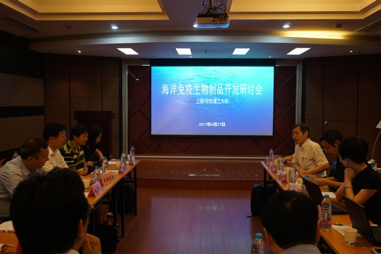 为贯彻落实国家海洋强国战略部署,针对新型海洋生物制品的研发需求,我院张元兴教授团队主持召开了“海洋免疫生物制品开发研讨会”。会议于2017年6月27日举行,刘琴教授主持。校科学技术发展研究院常务副院长朱为宏教授、我院副院长王启要教授参加了本次研讨会并代表学校和学院发言。中国科学院过程所、中国科学院海洋所、中国科学院大连化物所、水科院黄海所、华南农业大学等单位的多位领域专家参加了本次研讨会。与会专家就海洋生物来源寡糖植物免疫调节剂开发、新型海洋生物疫苗开发等问题进行了深入探讨,也为积极申报2018年国家重点研发计划项目奠定了基础。