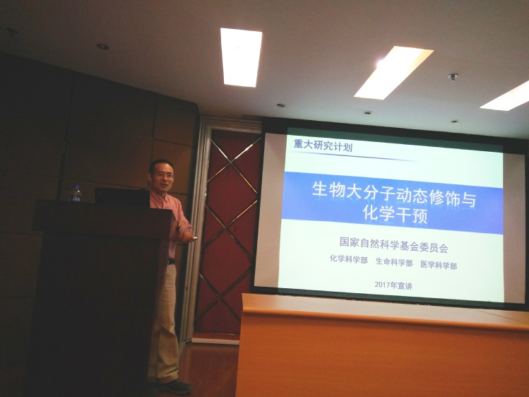 报告中,杨运桂研究员主要讲述了他们最近发表的Nature工作,围绕RNA 6-甲基腺嘌呤(m6A)修饰以及去甲基化酶FTO,由浅入深的将RNA密码在多层次上精确调控生命过程的绝妙发现分享给大家。在报告的最后,杨教授还宣讲了国家自然科学基金委的重大研究计划“生物大分子动态修饰与化学干预”。这一研究计划研究包括动态属性、识别机制以及化学干预几项主要内容,并强调充分发挥交叉学科的优势。报告会现场,同学们踊跃提问,师生们受益匪浅。