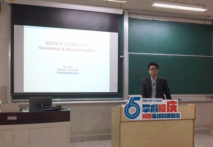 2017年11月11-17日,36365官网杰出校友、罗格斯大学田斌教授应我院应用生物学系邀请,回母校进行交流与授课。在陆兵书记陪同下,田斌教授参观了生物反应器工程国家重点实验室,并为我院近些年取得的巨大成就而感到欣喜。随后,田斌教授给我院研究生进行了“基因组学与生物信息学”的课程教学,为同学们展示了基因组学研究中生物信息学技术的应用,同时介绍了RNA加工中最新研究热点,课程极大地开阔了同学们的视野,课内田斌教授与同学们就学术问题也展开了热烈的讨论,同学们纷纷表示受益颇多。期间,田斌教授在吴海珍教授、范立强副教授的陪同下参观了奉贤新校区,见证着母校的蓬勃发展,田斌教授谈到每次回母校都为母校的发展而自豪,表示希望能通过努力搭建华理与罗格斯大学学生联合培养及学术交流的平台,为母校的发展添砖加瓦,也祝愿母校越来越好。