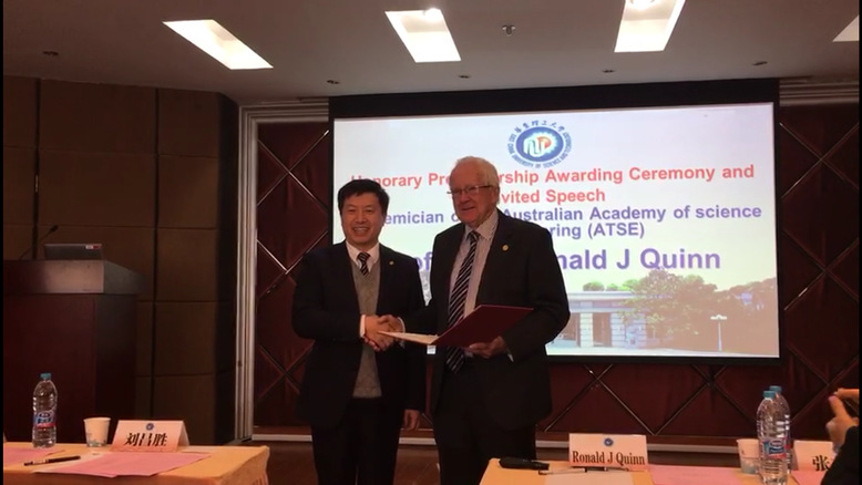 仪式结束后,Ronald J. Quinn教授应邀作了主题为“Bioinspiration from Natural Product Scaffolds and Traditional Chinese Medicine:- Ancient Knowledge/Modern Methods”的学术报告,介绍了天然产物研究的最新进展。