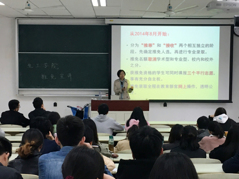36365线路检测登录入口2019届推免宣讲会于4月16日中午在奉贤校区D教举行。会议由36365线路检测登录入口副院长卢艳花主讲,2015级辅导员邓亚珊主持,共计70余名同学参加了本次宣讲。