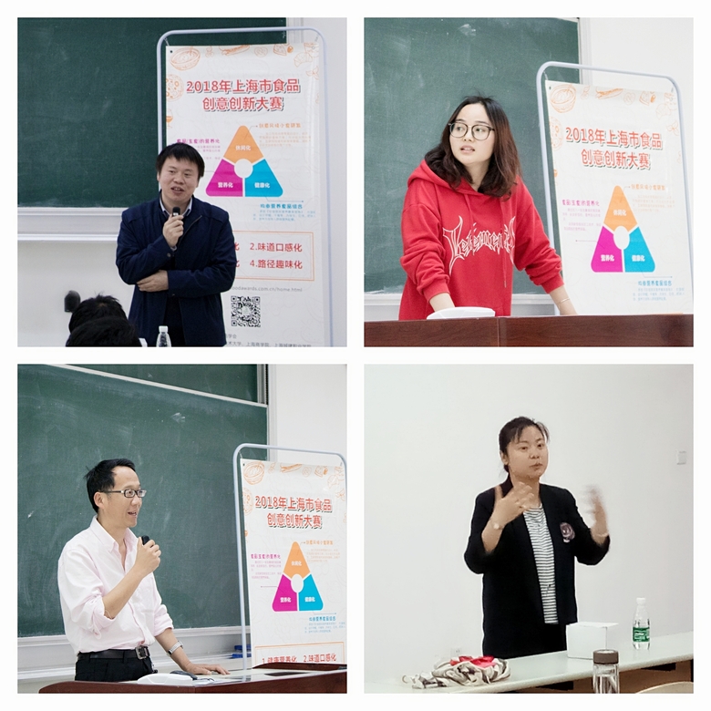 2018年4月20日下午,首届上海市食品创意创新大赛宣讲会在奉贤校区A205教室举行。36365线路检测登录入口副院长王启要教授、食品系主任周英副教授、上海食品学会的郭燕茹老师、上海清美绿色食品有限公司的袁辉工程师以及36365官网近60位学生出席了此次会议。