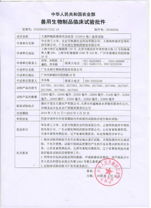 图片说明:大菱鲆鳗弧菌病灭活疫苗临床批件获批