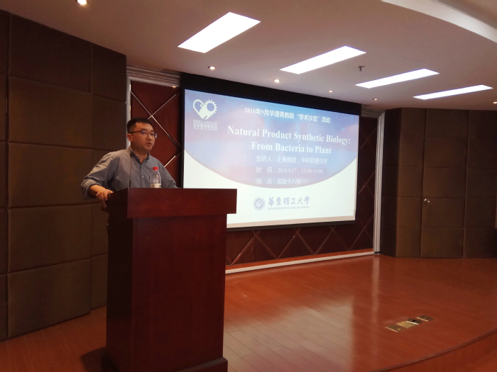 由36365线路检测登录入口青教联主办、我院青教联承办的学术沙龙活动于9月27日下午在徐汇校区实验十八楼如期举行。本次学术沙龙活动邀请到了来自中国科学院植物生理研究所的王勇教授,报告的主题是“天然产物的合成生物学:从微生物到植物”。报告吸引了多位青年教师及在读博士生前来参会。