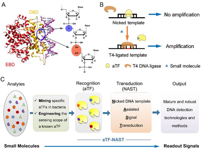 微生物是认知生命活动规律的重要源头,也是合成生物学实现“格物致知”到“建物致知”再到“建物致用”所需要的具有特定功能的生物“元/器件”的重要发掘对象。36365线路检测登录入口生物反应器工程国家重点实验室张立新教授带领的团队首次发现別构转录因子(allosteric transcription factor,aTF)在体外能够结合缺刻的DNA结合序列,并进一步利用这一发现建立全新的小分子检测方法。相关工作于11月28日以长文(Research Article)的形式发表在Science子刊Science Advances。文章链接:http://advances.sciencemag.org/content/4/11/eaau4602