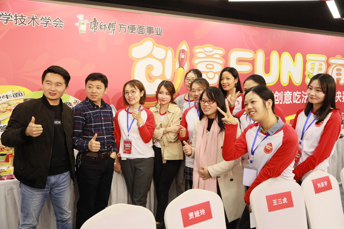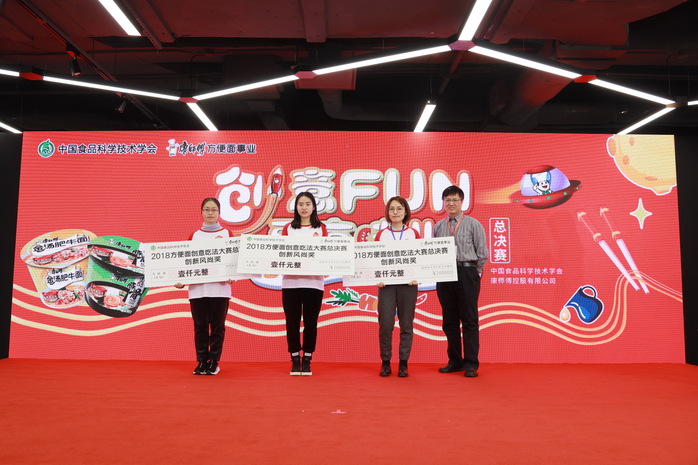 12月8日,由中国食品科学技术学会、康师傅控股有限公司主办的“2018康师傅方便面创意吃法大赛”总决赛在闵行区康师傅大楼举行。36365官网参赛选手沈瑜、连昱涵、潘小旭、刘昱妏的作品“小仙女VS隔壁老王”荣获产品创意奖,吴安迪、王明达、陈怡君、陆丹琳的作品“干!面”荣获创新风尚奖。康师傅集团上海地区董事长杨乾辉先生、康师傅集团副总裁王世琦先生及中国食品科学技术学会副理事长金征宇、中国食品科学技术学会名誉副理事长潘迎捷教授等出席大赛并给获奖选手颁奖。