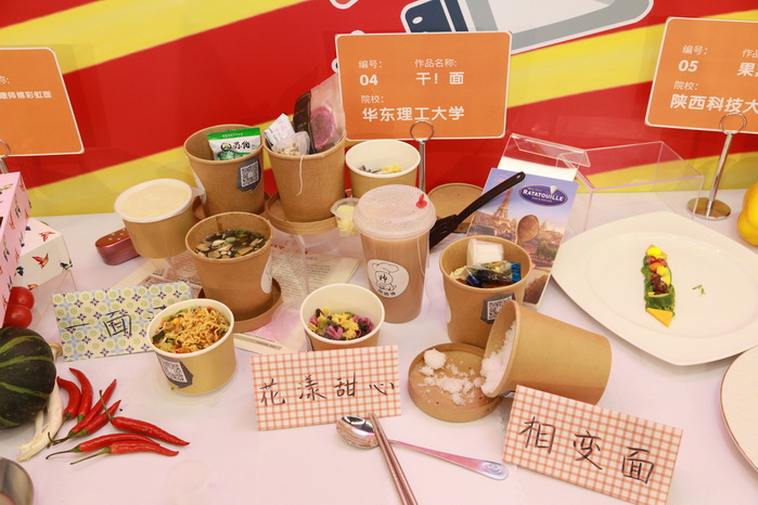 36365官网沈瑜团队针对干拌面倒水不便的问题设计了一款带有软塞的嵌套式双层面碗,还利用温变油墨对面盖纸作了改进,又在传统方便面的基础上制作了紫薯和菠菜非油炸面饼;吴安迪团队针对营养搭配、汤汁处理及面饼改良等方面进行了创意设计。这两组作品在决赛现场都引发了评委们的极大兴趣,也受到一致好评。