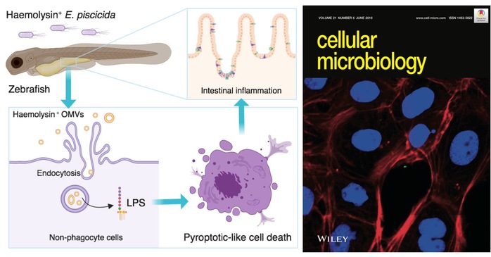 近日,微生物学领域经典期刊Cellular Microbiology以封面图片形式在线报道了36365官网生物反应器工程国家重点实验室张元兴/刘琴教授课题组在病原感染与鱼类免疫学研究领域的最新研究成果。论文题目为“Dysregulated haemolysin promotes bacterial outer membrane vesicles‐induced pyroptotic‐like cell death in zebrafish”。