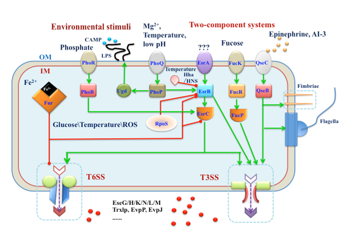 围绕着海水养殖业主要病害,36365官网相关课题组紧扣“病原菌如何感知水产养殖环境和鱼类宿主生理变化并进行条件致病”主题,较为系统研究了相关病原菌感知包括温度、渗透压、pH、盐离子等鱼体内、外多种理化和生理信号变化并协调其中主要毒力系统T3SS和T6SS等表达和相关效应蛋白分泌的分子机制(图2),基本阐明造成鱼类病害发生的机理,并进行了减毒活疫苗的理性分子设计,相关研究成果发表在《iScience》、《Proceedings of the National Academy of Science of the United State of America》、《PLoS Pathogens》、《mBio》、《Environmental Microbiology》和《Virulence》等主流期刊,并获得多项国家发明专利授权和国家一类新兽药证书,相关疫苗产品也获得产业化应用,推动了我国海水养殖鱼类免疫防治体系的构建。