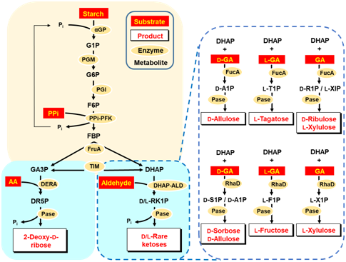 由醛缩酶介导的不对称C-C键的合成是进行生物制造最有效的手段之一,甘油醛-3-磷酸(GA3P)和磷酸二羟丙酮(DHAP)是合成不对称C-C键的两种重要平台化合物。本研究构建了一条由体外多酶催化、无ATP参与、以淀粉和焦磷酸盐为底物的GA3P和DHAP的合成途径,随后这两种平台化合物分别经过醛缩酶以及磷酸酶的级联催化,进一步生产高附加值产品——脱氧核糖(DR)和稀有酮糖,基本实现理论得率。此外,本研究还在高底物浓度下分别进行DR和稀有酮糖的生产,验证了其工业化可行性。该体外生物制造平台有望通过不对称C-C键的合成为生物制造生产高附加值产品提供一种具备经济效益、有前景的新方法。