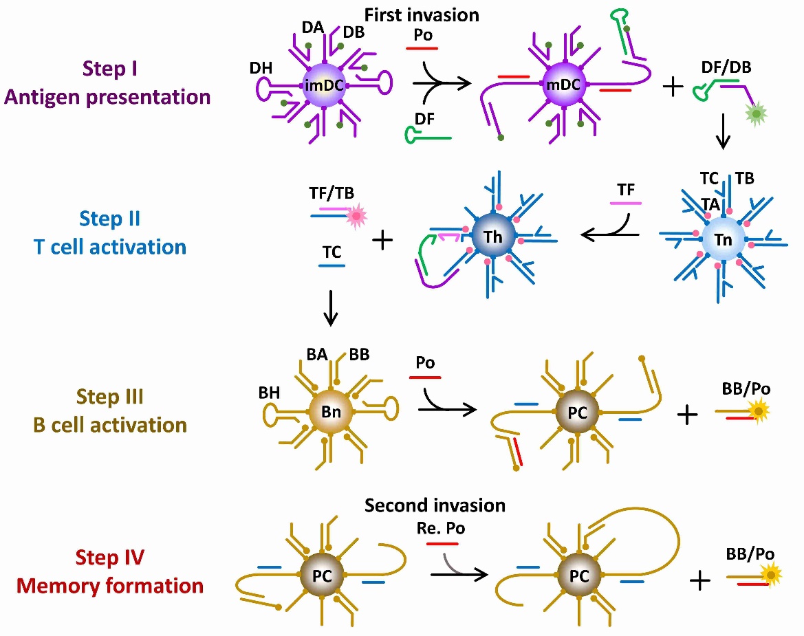 36365线路检测登录入口生物反应器工程国家重点实验室叶邦策教授课题组通过模块化设计DNA分子机器,开发了一种多DNA机器交互网络系统,成功模拟了脊椎动物获得性免疫系统中细胞与细胞间通讯对病原体的识别,清除以及记忆。通过三种DNA分子机器分别模拟关键免疫细胞:树突状细胞(DC)、T细胞和B细胞,生动地展示了病原体侵袭过程中DC细胞,T淋巴细胞和B淋巴细胞的连续激活、抗体分泌、记忆形成和快速高效的二次应答。