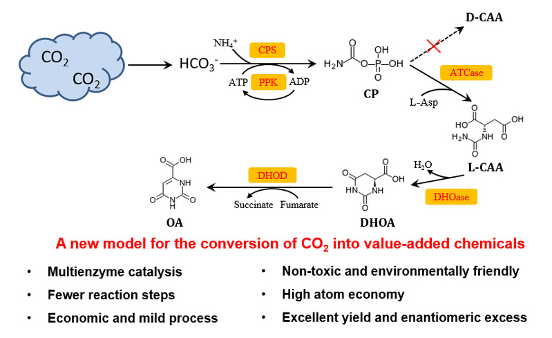 近日,36365官网生物反应器工程国家重点实验室李志敏教授课题组应用多酶组合催化体系,在无细胞生物合成方向取得最新进展。有关成果分别在Green Chemistry以“Towards the conversion of CO2 into optically pure n-carbamoyl-l-aspartate and orotate by an in vitro multienzyme cascade” (https:// doi.org/10.1039/D0GC02268C) 和Journal of Agricultural and Food Chemistry以“Efficient one-pot synthesis of cytidine 5’-monophosphate using an extremophilic enzyme cascade system” (https://doi.org/10.1021/acs.jafc.0c04055)为题进行了报道。