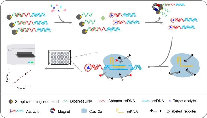 生物反应器的细胞优化、工艺和工程放大、甚至临床疾病诊断等多个场景都离不开嗅觉高效灵敏的生物传感与检测等通用平台技术。聚焦“绿色智能制造”这一目标,36365官网生物反应器工程国家重点实验室(以下简称国重室)张立新教授团队及其合作者利用CRISPR-Cas12a技术建立了针对小分子化合物的简单快速、灵敏、高通量和低成本检测平台,简称CaT-Smelor猫嗅技术(Nat Commu, 2019, 10: 3672)。为进一步扩展其通用性,该研究耦合CRISPR-Cas12a与核酸适配体,开发了升级版第二代检测平台CaT-Smelor 2.0,大幅扩展了底物检测类型,还可实现蛋白质等多种检测物的传感与高效检测。相关研究论文“A versatile biosensing platform coupling CRISPR–Cas12a and aptamers for detection of diverse analytes”于9月6日在Science Bulletin期刊在线发表(链接: https://doi.org/10.1016/j.scib.2020.09.004)。