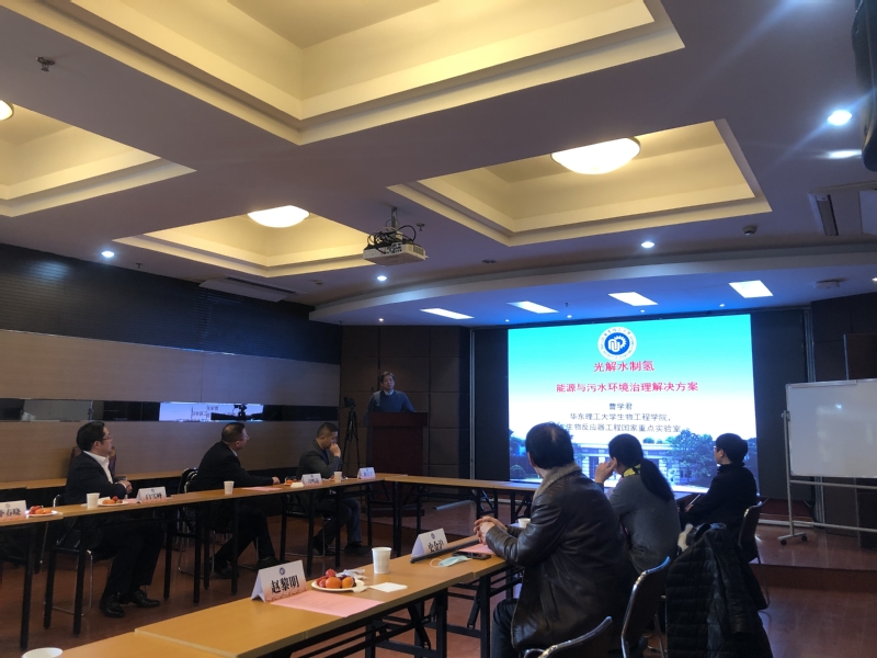 座谈会上,曹学君教授做了题为“光解水制氢”的报告。报告中,曹学君教授从解决能源问题与环境污染问题引入,简要介绍了目前光解水制氢技术研发中从实验室走向工业化应用所面临的诸多挑战,并汇报了在光解水制氢催化剂及室外自然光解水制氢装置等方面取得的研究进展。项目合作单位上海洁能科技有限公司领导介绍了储氢材料研发进展。会上,领导和来宾热烈讨论氢能发展,就氢能源的未来合作进行了深入商谈。