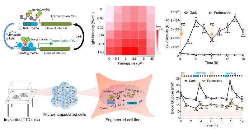 在这项工作中,研究团队创新发展了一种基于BRET(生物发光能量共振转移)的LuminON哺乳动物细胞基因表达调控系统。在该系统中,光敏元件中的荧光素酶催化底物furimazine发出460 nm波长的蓝光,通过分子内的能量转移激活光敏元件,进而启动目的基因的转录与表达。研究结果表明,LuminON系统可以同时响应生物发光和外置蓝光。增加底物浓度或增强光照强度均可显著提高目的基因的表达水平,为不同的应用场景提供非常灵活的选择性。进一步的研究结果表明LuminON系统对基因表达的激活是脉冲式的,且脉冲的幅度和周期均可通过furimazine底物的剂量进行精确控制。除了培养的细胞,LuminON系统同样可以实现小鼠体内基因表达的脉冲式反复激活。最后,研究团队利用LuminON系统调控胰岛素的脉冲式表达,可以很好地控制I型糖尿病小鼠餐后的血糖稳态。