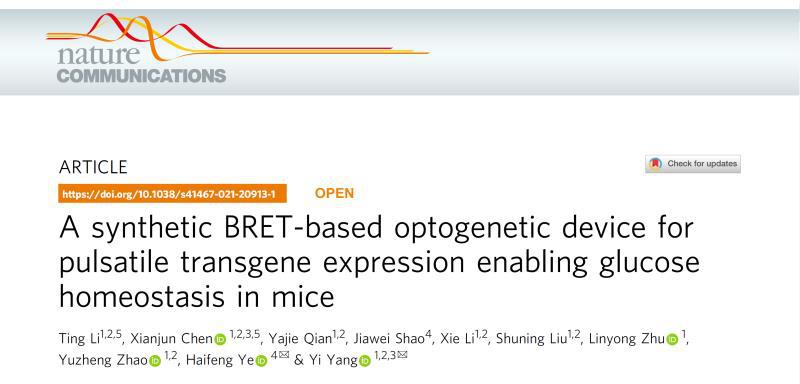 近日,36365官网生物反应器工程国家重点实验室和光遗传学与合成生物学交叉学科研究中心杨弋教授团队在国际权威学术期刊Nature Communications发表题为“A synthetic BRET-based optogenetic device for pulsatile transgene expression enabling glucose homeostasis in mice”的研究论文,报道一种新型基因表达调控技术,可脉冲式激活哺乳动物细胞和小鼠体内的基因表达。