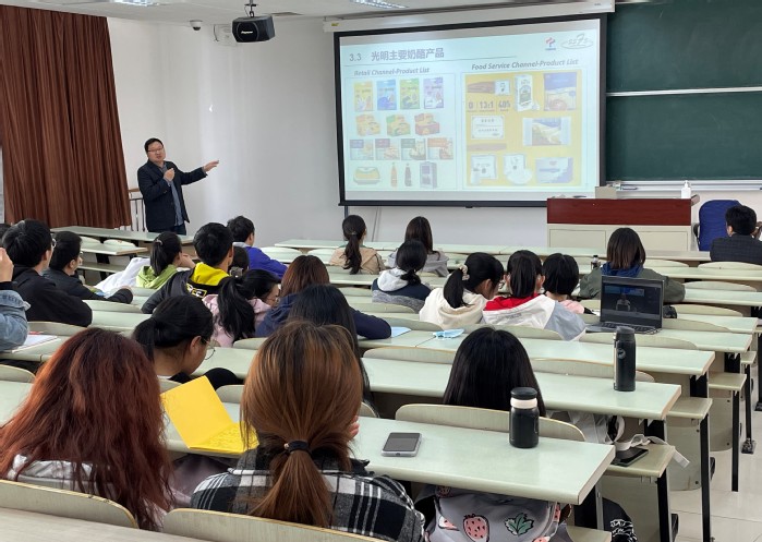 贾宏信介绍了光明乳业的基本情况和奶酪相关的基本知识,并细致解读了本次大赛主题。他强调,开发适合中国人吃的奶酪要充分考虑地域感官偏好性、饮食习惯、消费习惯等具体因素,开发零食奶酪还要考虑到消费场景、便携性、跨界搭配等。随后,他对奶酪的生产工艺和法规标准也进行了专业解读。通过解读,学生们对奶酪的创新有了更为全面的认识。