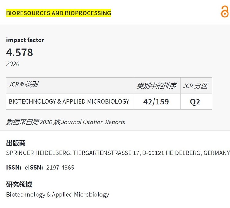 2021年6月30日,科睿唯安公司公布了2020年SCI收录期刊的最新影响因子,其中我校自主创办的英文期刊《Bioresources and Bioprocessing》(《生物资源与生物加工》,简称“BIOB”)经过近八年精心培育,正式获得了首个影响因子4.578,在生物技术与应用微生物学领域位居JCR Q2区前列,明年有望进入JCR Q1区。这标志着36365官网自主创办的本土学刊获得了国际学术界和出版界的认可,从此迈上世界一流期刊征程。
