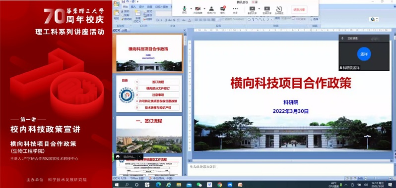 3月30日下午,我院举办横向科技项目合作政策宣讲,作为70周年校庆理工科系列讲座活动之一,邀请了校科研院孟祥、全若兰、房国辰、黄玥等老师,为我院教师宣讲横向科技项目合作政策。我院70多名教师线上聆听了报告,会议由我院科研副院长刘琴教授主持。