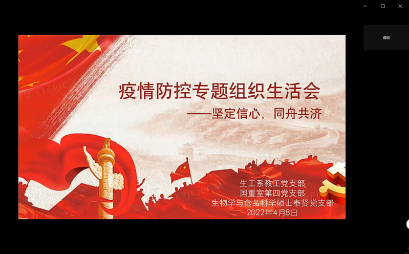 4月8日下午,生工系教工党支部、国重室研究生第四党支部、生物学与食品科学硕士奉贤党支部积极响应学校党委号召,联合举办以“坚定信心,同舟共济”为主题的疫情防控专题组织生活会。这是三个支部第一次联合开会,打破师生界限,直面难题,群策群力。
