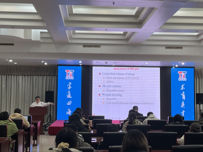 开讲前,张立新介绍了罗丹教授的教育背景及科研经历,将“生化环材”学生专业背景、就业疑惑和罗丹的研究工作紧密衔接。报告伊始,罗丹首先提出了一个引人入胜的观点,认为DNA不仅仅是一种遗传材料,更是一种神奇的多功能通用材料。通过有趣的提问,他循序渐进地解释了DNA为何如此神奇。详细介绍了实验室如何通过高效的酶反应,首次在全球范围内大规模合成了宏观的纯DNA水凝胶、无需细胞即可生产蛋白质的P胶以及没有生命却能够制造蛋白质的人工细胞。这一系列创新为“无细胞合成生物学”开辟了一条崭新的道路。