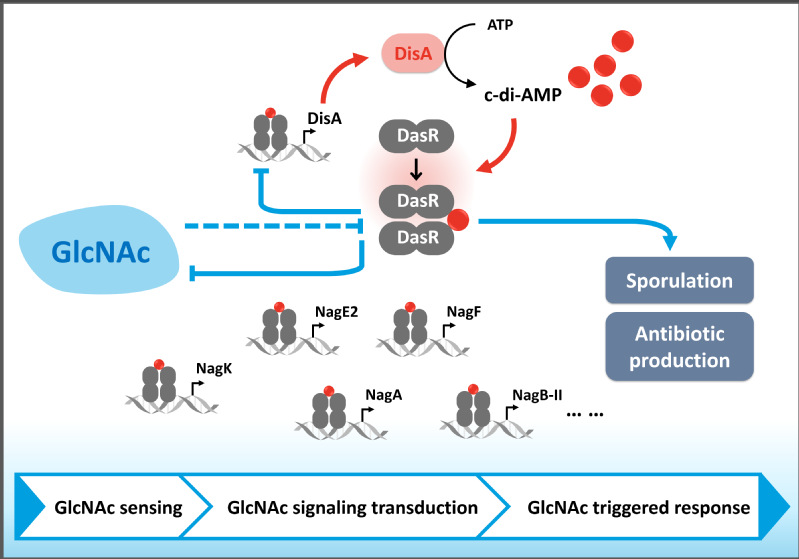 叶教授团队研究发现,红霉糖多孢菌GntR家族调控因子 DasR 是一种新型c-di-AMP 受体蛋白,并且对 c-di-AMP 合成发挥直接转录调节作用。c-di-AMP 可变构激活 DasR与其靶基因的结合能力,当细胞内 c-di-AMP 水平较高时,能够触发对初级 GlcNAc 代谢和 DasR 介导的次级代谢的连续响应。此外,高水平的c-di-AMP 条件能够屏蔽GlcNAc对孢子发育和抗生素合成的不利影响,显著增强孢子分化以及红霉素的合成能力。由于c-di-AMP合成酶DisA也是DasR的调控靶标,其转录水平受到DasR的负调控,当细胞内c-di-AMP水平过高时,还可通过DasR介导的反馈调控回路维持c-di-AMP的内稳态,以避免c-di-AMP的过度累积。进一步研究以及进化分析显示,这种由c-di-AMP变构调节DasR主导的互作模式在放线菌属中尤其是链霉菌中高度保守,从而表明通过调节该细胞内的c-di-AMP水平,控制放线菌生长发育和抗生素生产,以及应对环境胁迫具有广泛的意义。