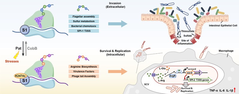 在该研究中揭示了一种新型的细菌毒力调控机制:鼠伤寒沙门氏菌通过动态调控核糖体蛋白S1的K247可逆乙酰化状态,实现翻译程序的精确重编程,从而适应宿主不同感染阶段的环境压力。研究证实, K247乙酰化由乙酰转移酶Pat和去乙酰化酶CobB动态调控。通过核糖体-新生肽链测序技术(RNC-Seq)分析,发现K247非酰基化状态倾向于结合鞭毛组装、硫代谢及SPI-1 T3SS相关mRNA,促进细菌早期侵袭能力;K247乙酰化则偏好性招募精氨酸合成及SPI-2相关mRNA,其中L-精氨酸可通过激活调控蛋白ArgR进一步上调SPI-2毒力因子的表达,从而增强细菌在巨噬细胞内的存活与复制能力。这一机制的发掘不仅阐明了病原菌利用翻译调控优化毒力表达的分子机制,也为开发针对核糖体翻译调控的新型抗菌策略提供了潜在靶点。